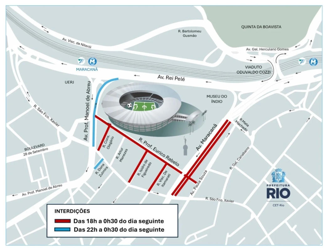 – Rua Professor Eurico Rabelo;– Rua Visconde de Itamarati, entre a rua São Francisco Xavier e a rua Professor Eurico Rabelo;– Rua Isidro de Figueiredo;– Rua Artur Menezes;– Rua Conselheiro Olegário;– Avenida Paula Sousa, lado esquerdo, entre a rua São Francisco Xavier e a rua Professor Eurico Rabelo.ROTAS ALTERNATIVASProvenientes do Centro e Zona Sul:- Para a Tijuca: Utilizar a Avenida Paulo de Frontin e Rua Dr. Satamini, ou seguir pela Praça da Bandeira, Rua Pará ou Rua Paraíba e, em seguida, Rua Mariz e Barros;- Para Vila Isabel e Grajaú: Utilizar a Avenida Paulo de Frontin e Rua Dr. Satamini, ou seguir pela Praça da Bandeira, Rua Pará ou Rua Paraíba, Rua Mariz e Barros e, em seguida, Rua Major Ávila e Rua Felipe Camarão;- Para a região do Grande Méier: Utilizar a Rua Visconde de Niterói.Provenientes da Tijuca, Grajaú, Vila Isabel e entorno:- Para o Centro e a Zona Sul: utilizar a rota Conde de Bonfim e a Haddock Lobo.Provenientes do Grande Méier:- Para o Centro e a Zona Sul: utilizar a rota da Rua Visconde de Niterói.MORADORES DO ENTORNOO acesso aos veículos dos moradores que residem nas imediações do Maracanã (ruas Professor Eurico Rabelo, Visconde de Itamarati, Isidro de Figueiredo, Artur Menezes e Conselheiro Olegário) será feito, exclusivamente e mediante apresentação do comprovante de residência, pela Avenida Paula Sousa e a Rua Professor Eurico Rabelo.O torcedor pode acompanhar, em tempo real, as atualizações da previsão do tempo pelo twitter.com/operacoesrio e no aplicativo COR.Rio, disponível gratuitamente nas versões Android (bit.ly/appcor_android) e iOS (bit.ly/appcor_ios).