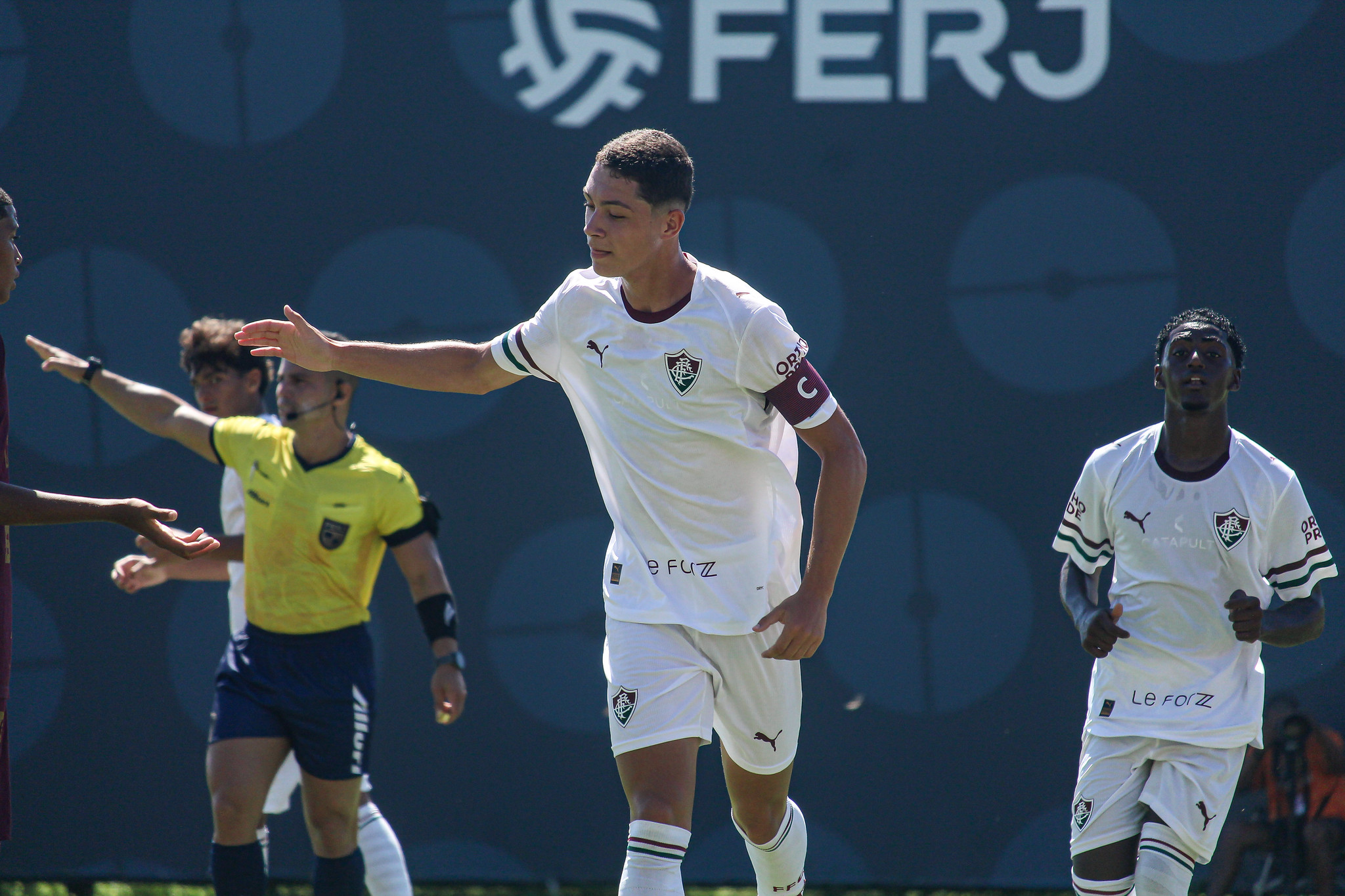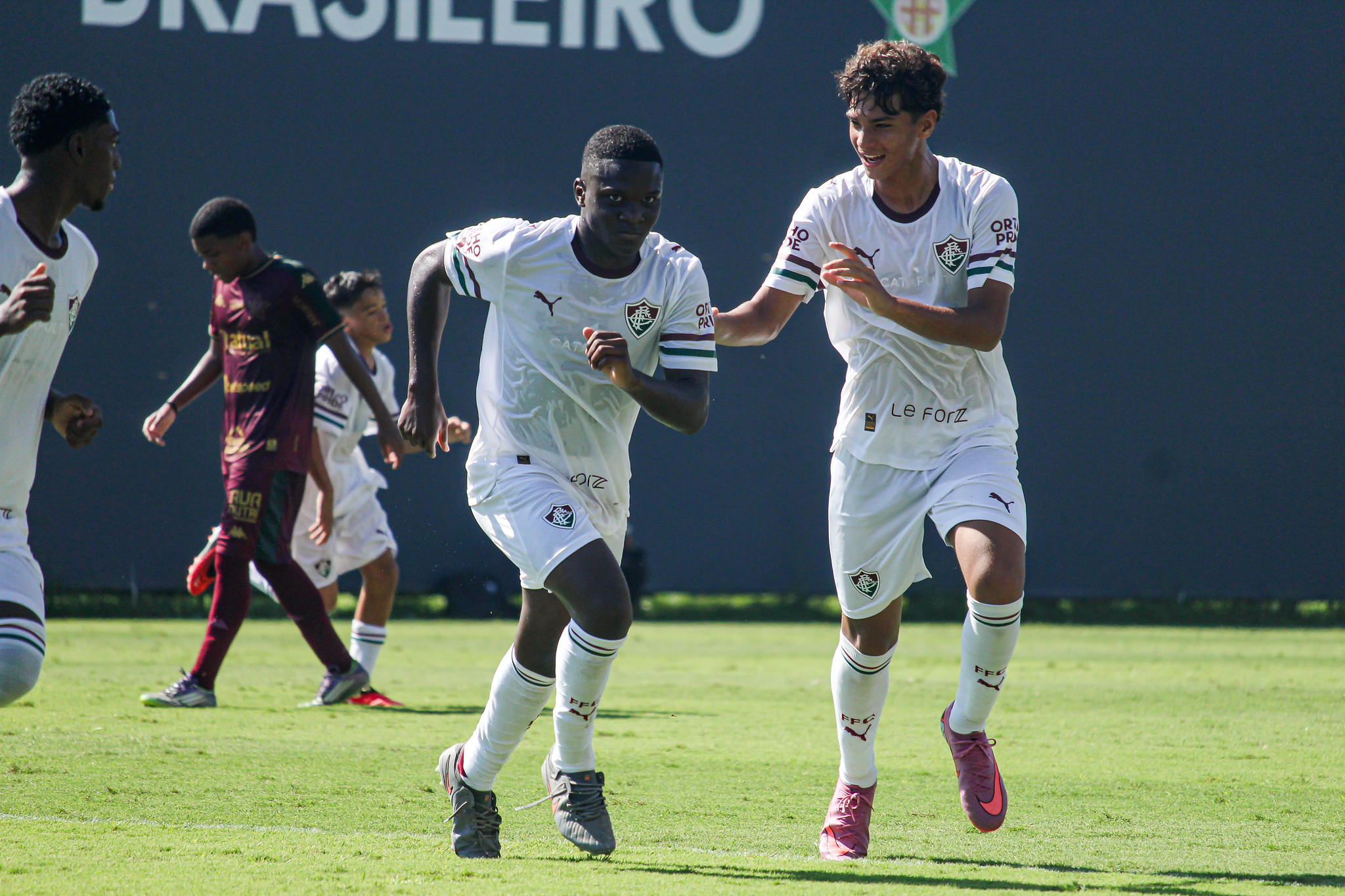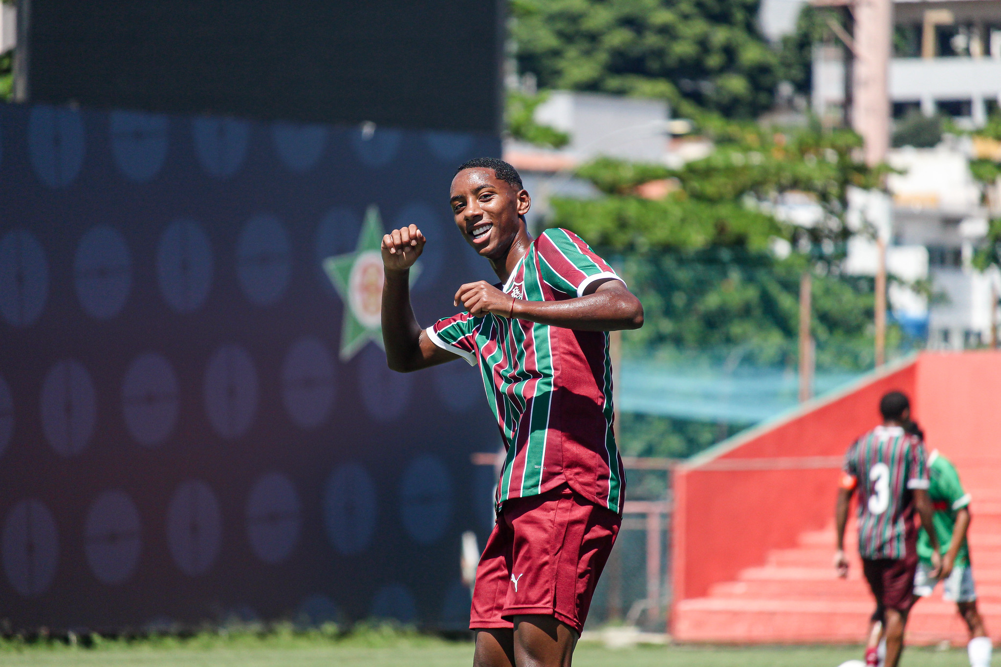 Sub-15 do Flu sofre primeiro gol, mas vence em meio a bolas na traveO Sub-15 do Fluminense, que abriu a jornada dupla com time misto, segue com 100% de aproveitamento na campanha pelo bicampeonato da Taça Guanabara. A molecada do técnico Dalmo Gimenes foi a nove pontos ao vencer o vice-lanterna por 2 a 1. A vitória mantém o Tricolor no terceiro lugar, com a mesma pontuação dos líderes.Depois de acertar a trave com Bê Leão, o Flu abriu o placar, aos 23 minutos, com Matheus Alexandre, que desarmou o defensor e finalizou da ponta direita. Foi o terceiro gol do atacante, que balançou a rede em todos os jogos até aqui.