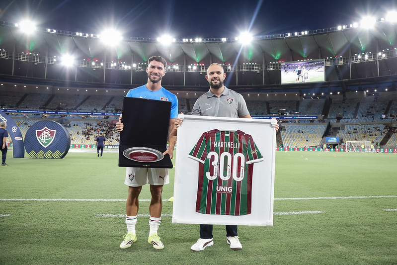 O volante Martinelli foi homenageado antes da partida desta quinta-feira (12/02), contra o Botafogo, após completar 300 partidas pelo Fluminense no último domingo (08/02). Ao entrar no gramado do Maracanã para o aquecimento, o volante recebeu das mãos do presidente Mattheus Montenegro um prato comemorativo e uma camisa enquadrada com o número da marca e seu nome.Com 300 jogos pelo Fluminense, o volante é o Moleque de Xerém com mais partidas pela equipe profissional do Tricolor de forma isolada. Além disso, Martinelli é o quinto jogador que mais vestiu a armadura tricolor no século, e o 32ª com mais atuações na história do clube.Martinelli tem 16 gols marcados e títulos importantes pelo Fluminense. O volante foi peça importante nas conquistas da Conmebol Libertadores 2023, da Conmebol Recopa 2024, do bicampeonato Carioca e dos títulos da Taça Guanabara em 2022, 2023 e 2026.Com Martinelli no time titular, o Fluminense enfrenta o Botafogo nesta quinta-feira (12/02), às 19h30, em jogo válido pela terceira rodada do Campeonato Brasileiro.Texto: Comunicação/FFCFoto: Marcelo Gonçalves/FFC